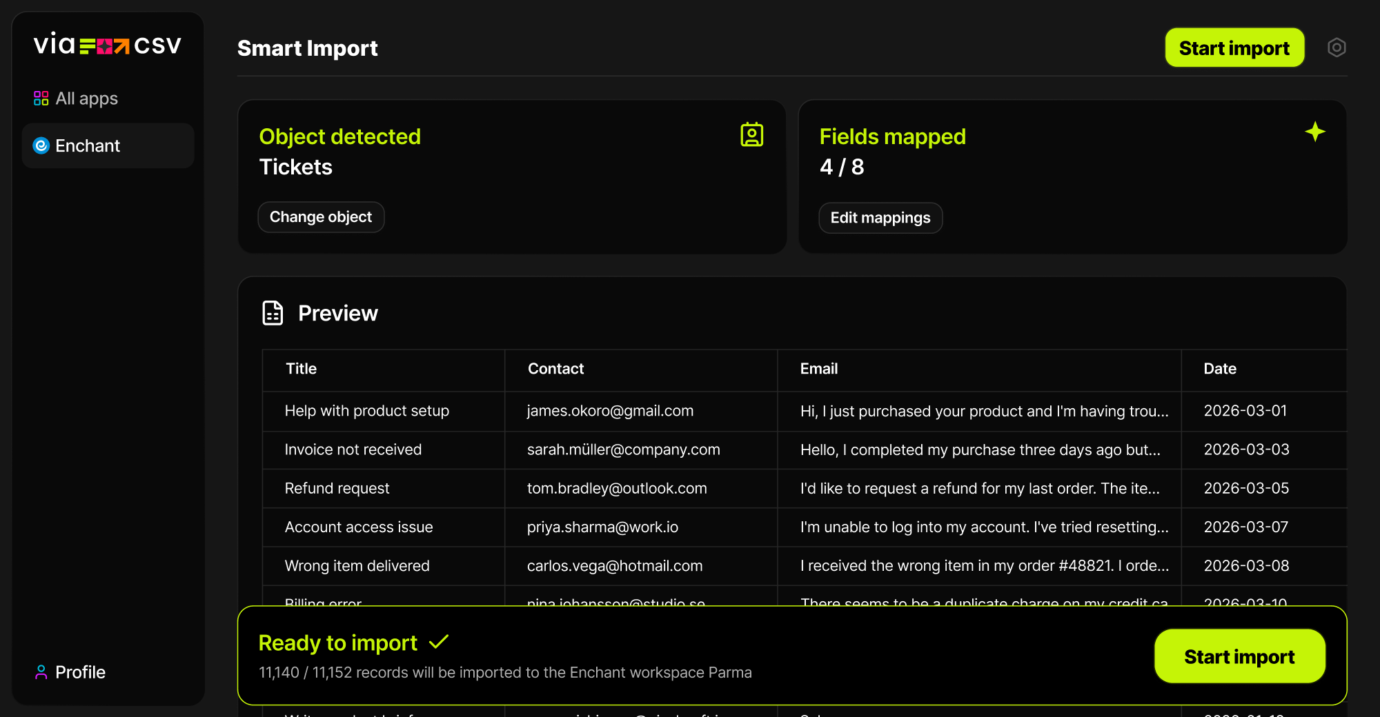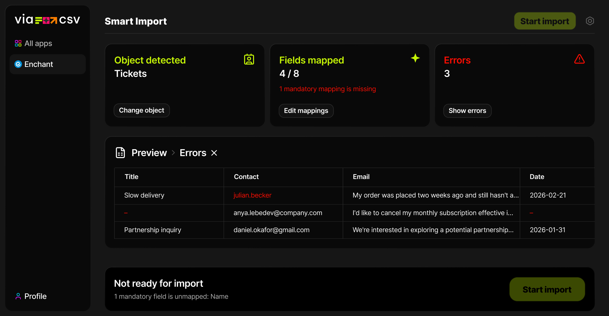 Native import works best when your file is already clean and perfectly structured. ViaCSV is built for real-world CSVs. It helps you map columns faster, clean up messy values, handle format issues, and review the import before anything is written.