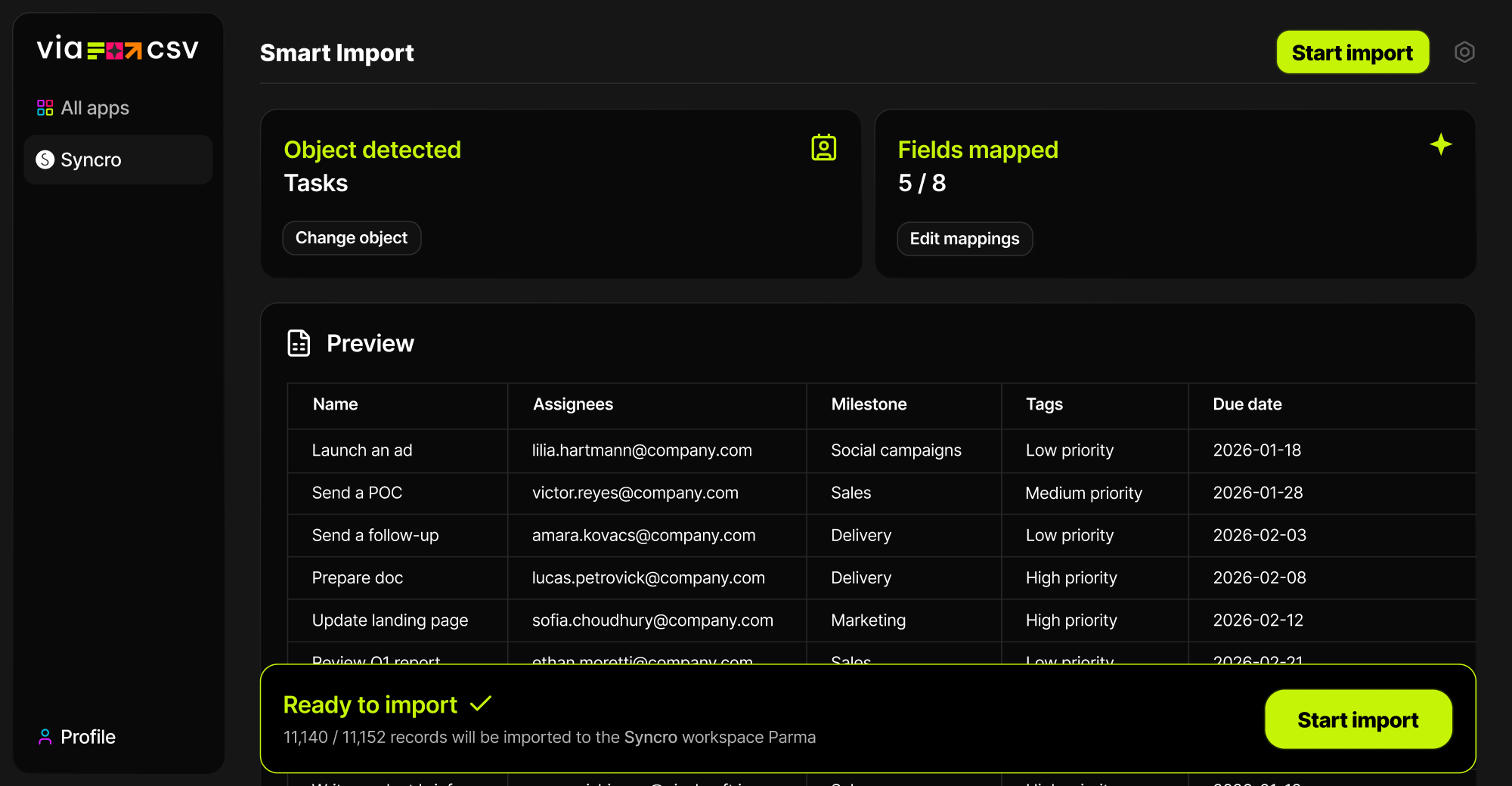 Native import works best when your file is already clean and perfectly structured. ViaCSV is built for real-world CSVs. It helps you map columns faster, clean up messy values, handle format issues, and review the import before anything is written.