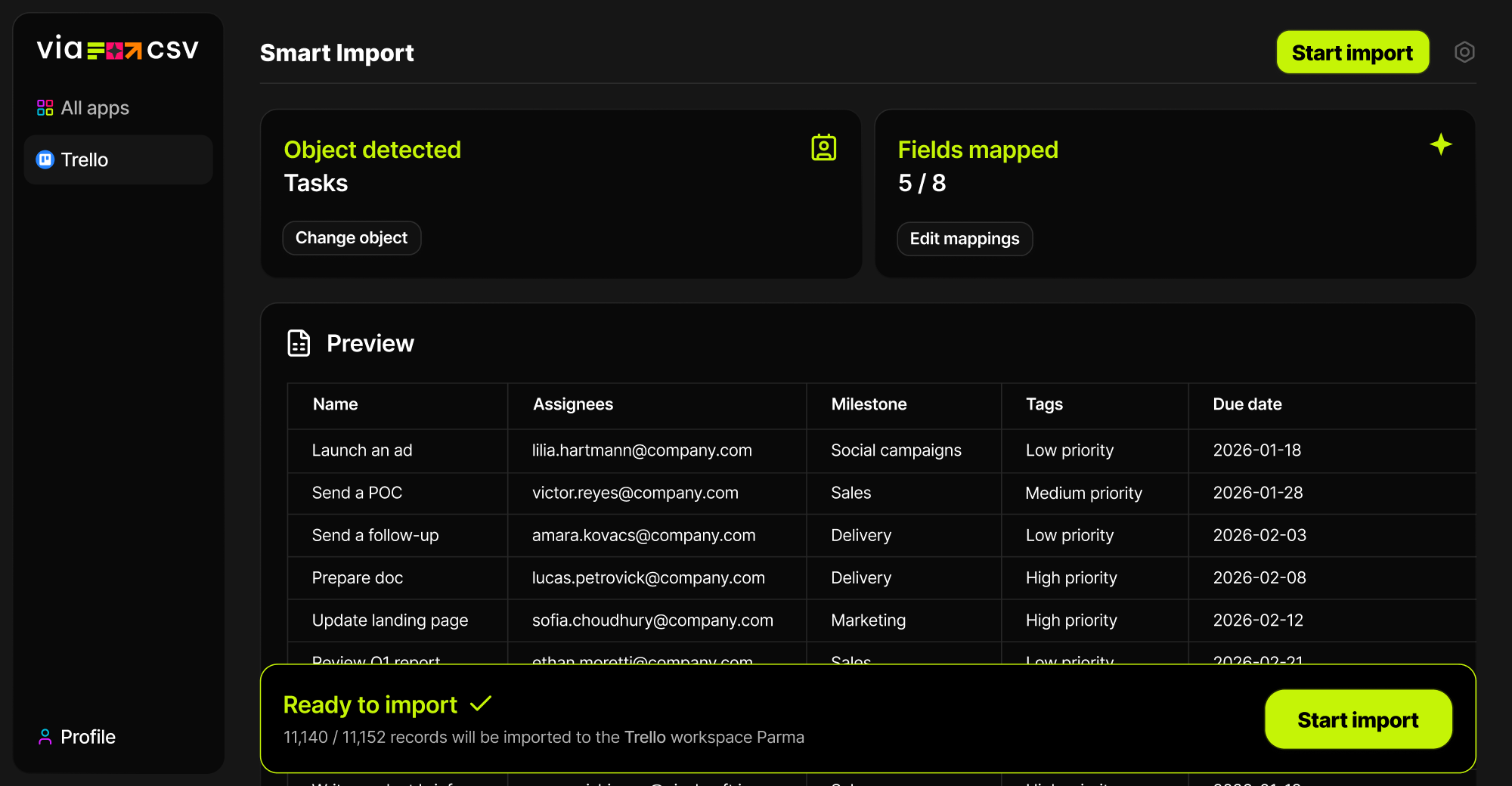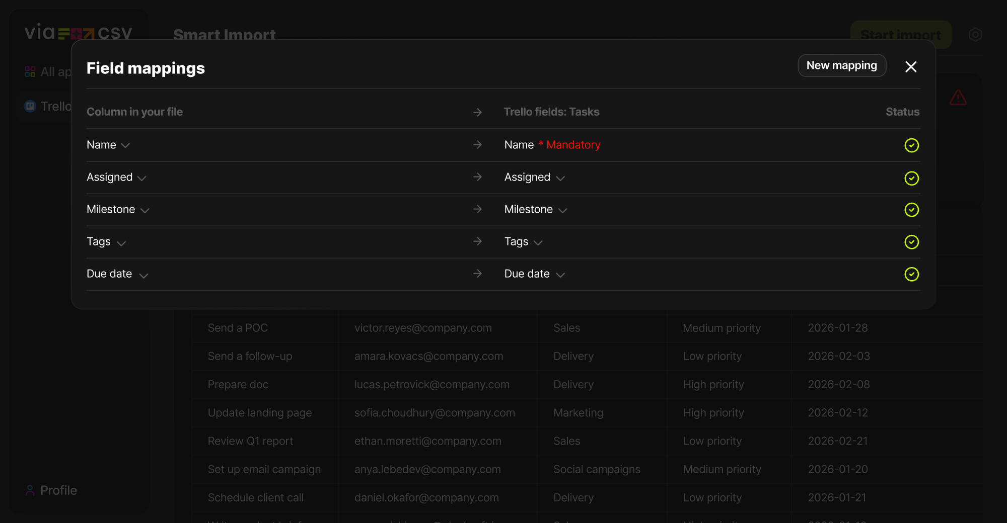 ViaCSV will map what it can automatically and highlight what needs attention